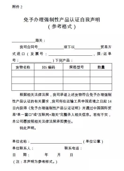 一、對于符合免予辦理強制性產品認證的進口汽車零部件(HS編碼范圍見附件1),報關單位可憑收貨人自行出具的《免予辦理強制性產品認證自我聲明》(以下簡稱《自我聲明》,參考格式見附件2),按《免予辦理強制性產品認證進口汽車零部件申報指南》(附件3)要求辦理申報手續后,即可將貨物提離口岸。